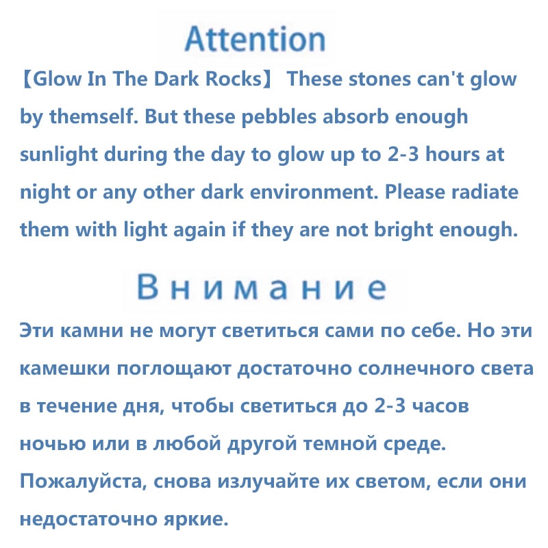 【Glow In The Dark Rocks】 These stones can’t glow by themself. But these pebbles absorb enough sunlight during the day to glow up to 2-3 hours at night or any other dark environment. Please radiate them with light again if they are not bright enough.