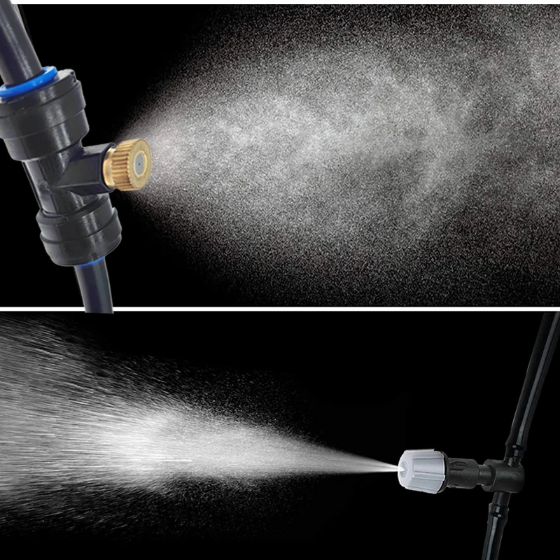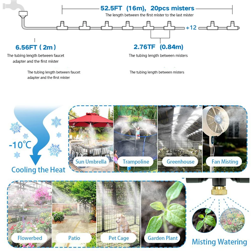 【Premium Product Quality】: Galvanized solid brass hose/faucet connecting adapter, flexible and UV-resistant black PU tubing, exclusive brass misting nozzles, good sealing tubing connector,all these premium composition accessories are used to made the misting cooling system, and no leaking, no blocking, no rusting and longlife use